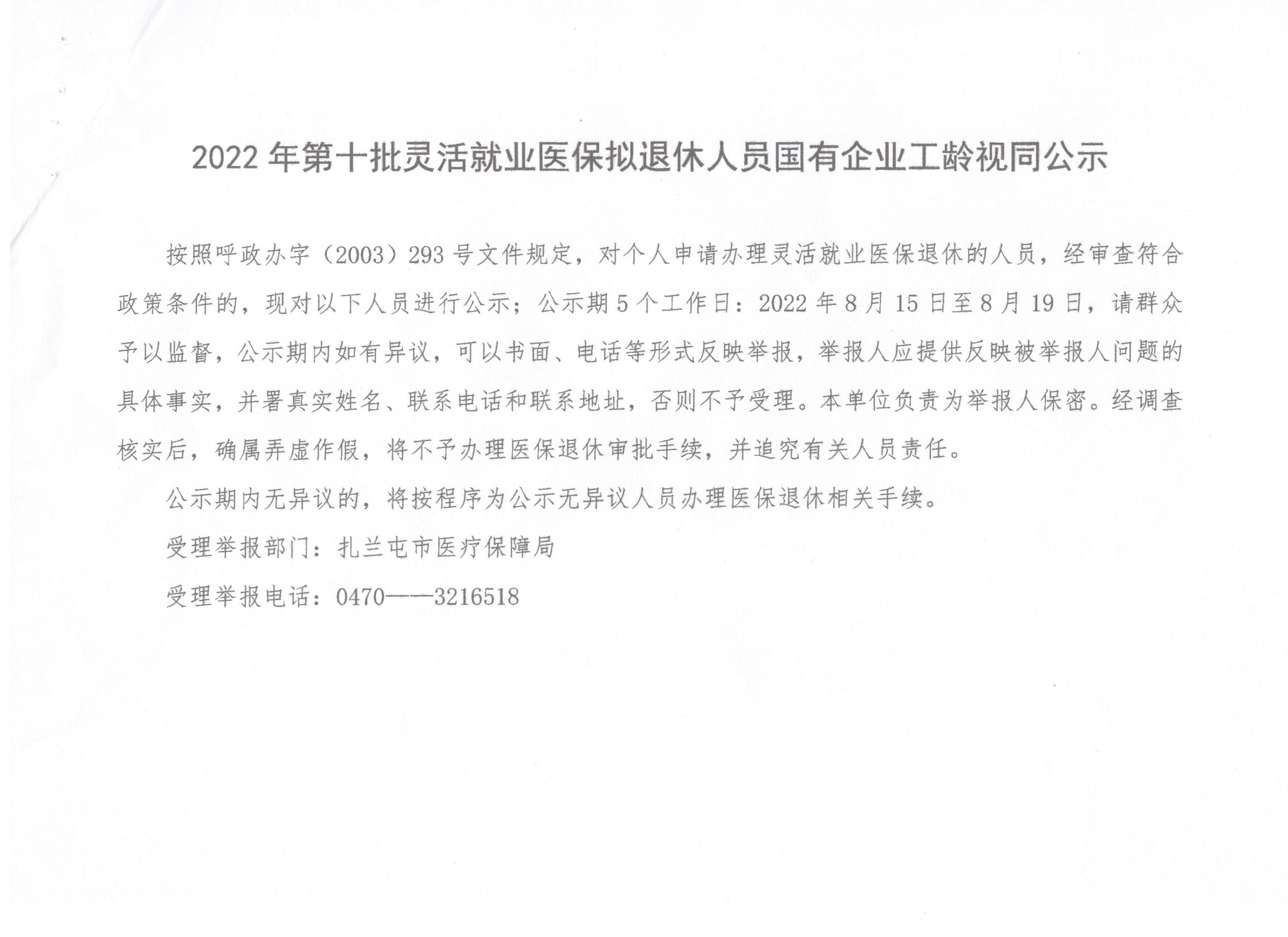 2022年第十批灵活就业医保拟退休人员国有企业工龄视同公示