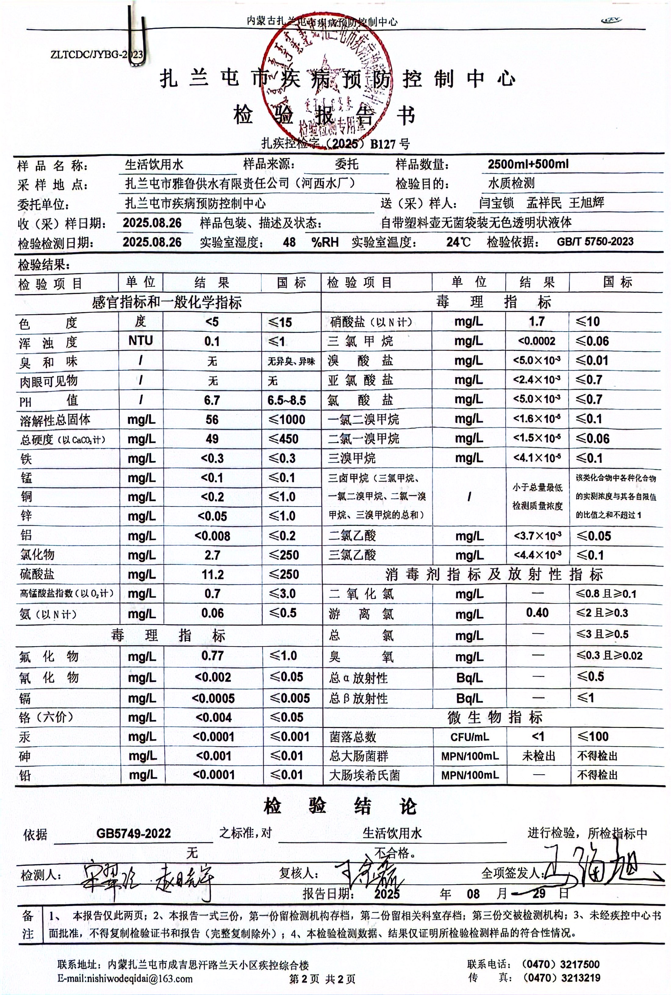 扎兰屯雅鲁供水2025年8月份检验检测报告