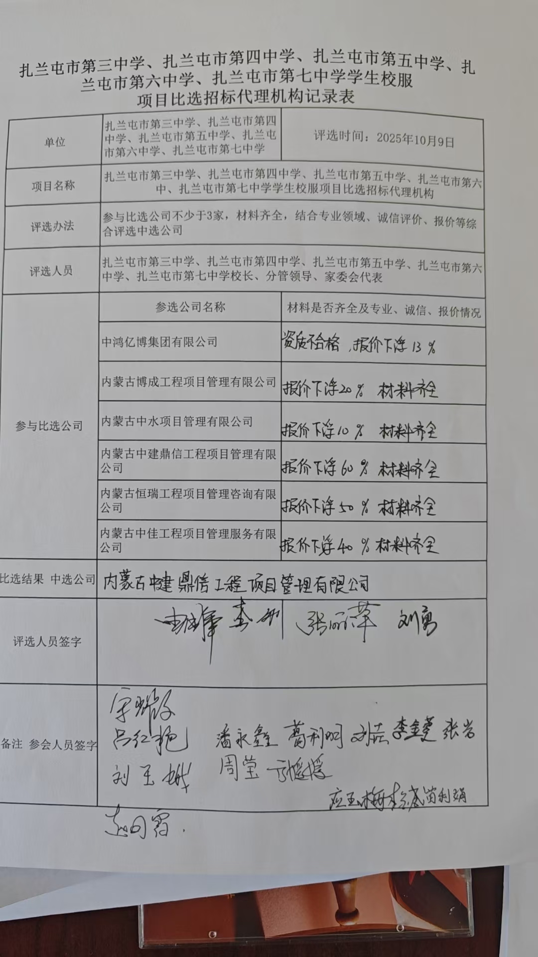 2024欧洲杯下注平台_澳门现金网-官网2025年扎兰屯市第三中学、扎兰屯市第四中学、扎兰屯市第五中学、扎兰屯市第六中学、扎兰屯市第七中学学生校服项目比选招标代理机构,依据相关法律规定,五所学校于2025年10月9日,对参与比选的“中鸿亿博集团有限公司”“内蒙古博成工程项目管理有限公司”“内蒙古中水项目管理有限公司”“内蒙古中建鼎信工程项目管理有限公司”“内蒙古恒瑞工程项目管理咨询有限公司”“内蒙古中佳工程项目管理服务有限公司”6家公司,进行了公开比选。
