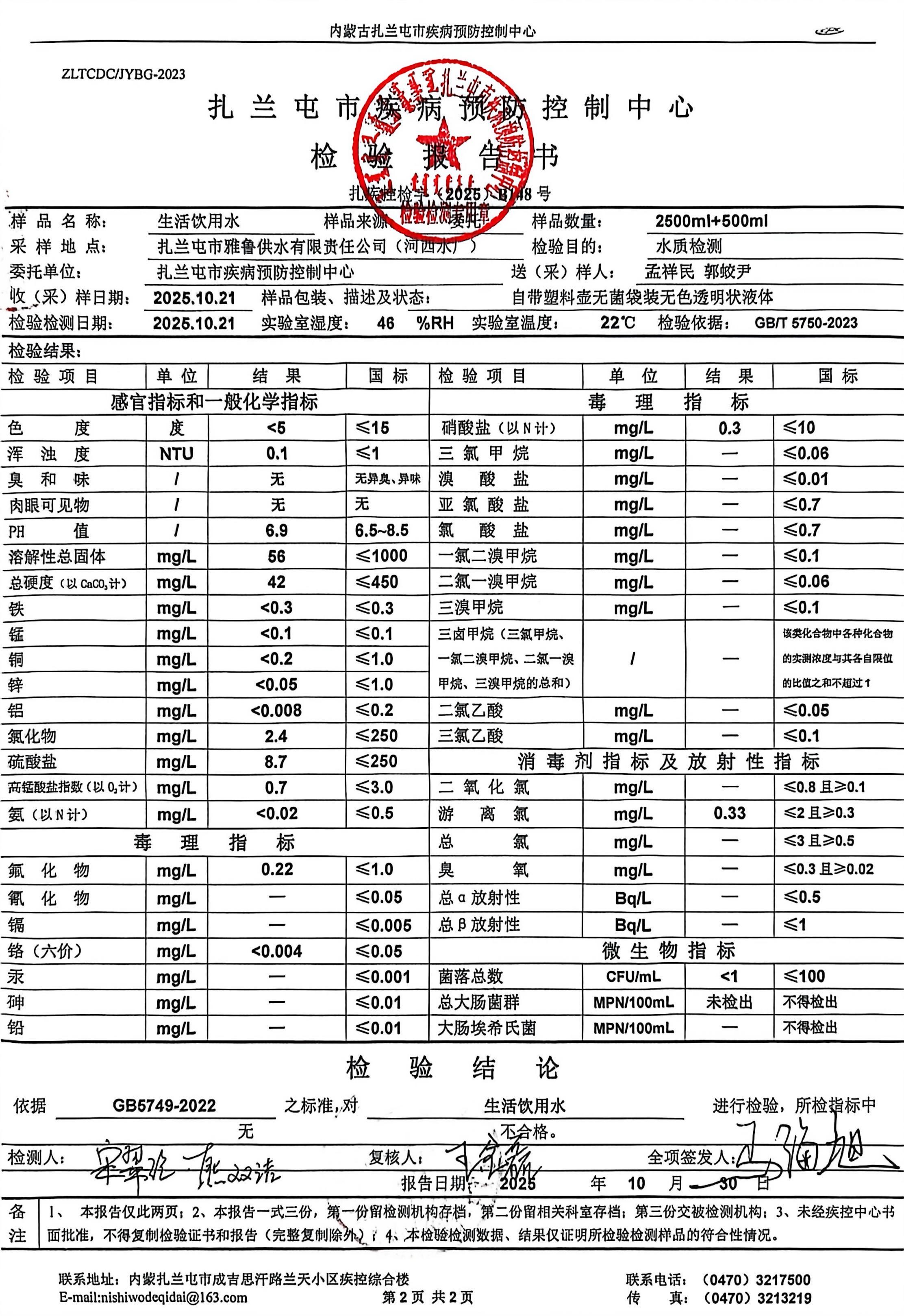 扎兰屯雅鲁供水2025年10月份检验检测报告